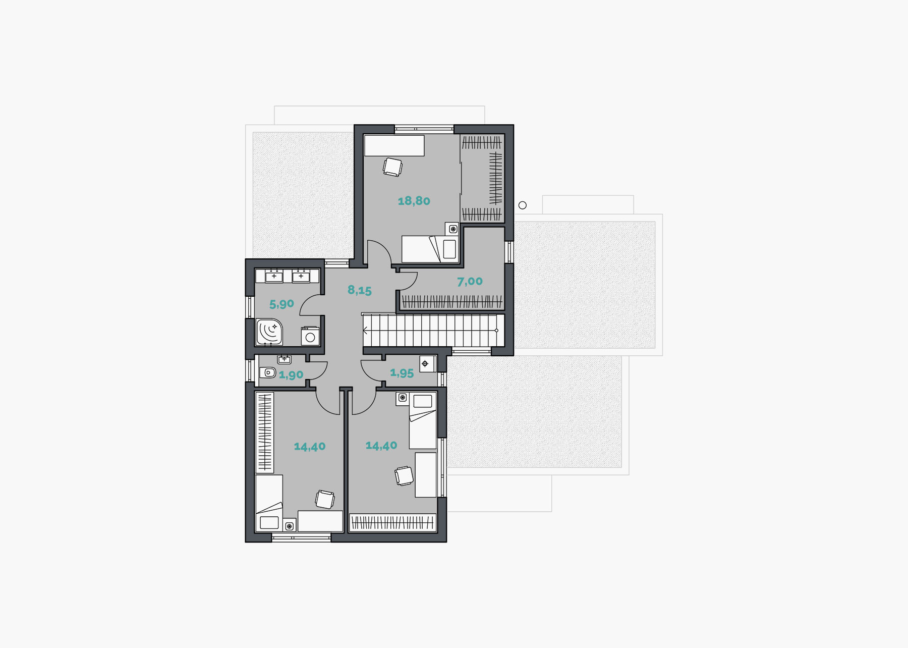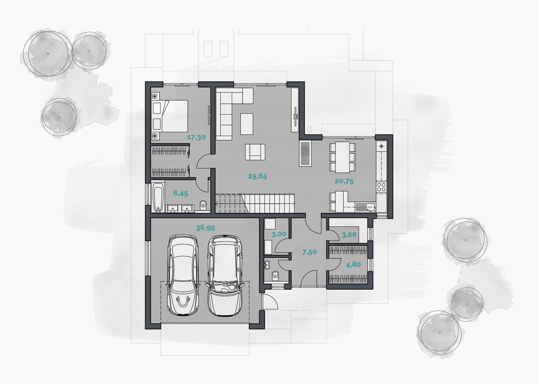 Na prízemí sa nachádza kryté závetrie, zádverie, WC, šatník, komora, technická miestnosť, kuchyňa s jedálňou, obývacia izba so schodiskom, spálňa s kúpeľňou, a dvojgaráž. Na poschodí sú dve izby, spálňa, kúpeľňa, WC, miestnosť pre kotol ústredného kúrenia, šatník a chodba. Jednotlivé podlažia sú prepojené schodiskom. Z obývacej izby, zo spálne a z kuchyne je možný prechod na terasu, ktorá môže v letnom období slúžiť pre vonkajšie stolovanie. Do dvojgaráže je vstup riešený cez exteriér.