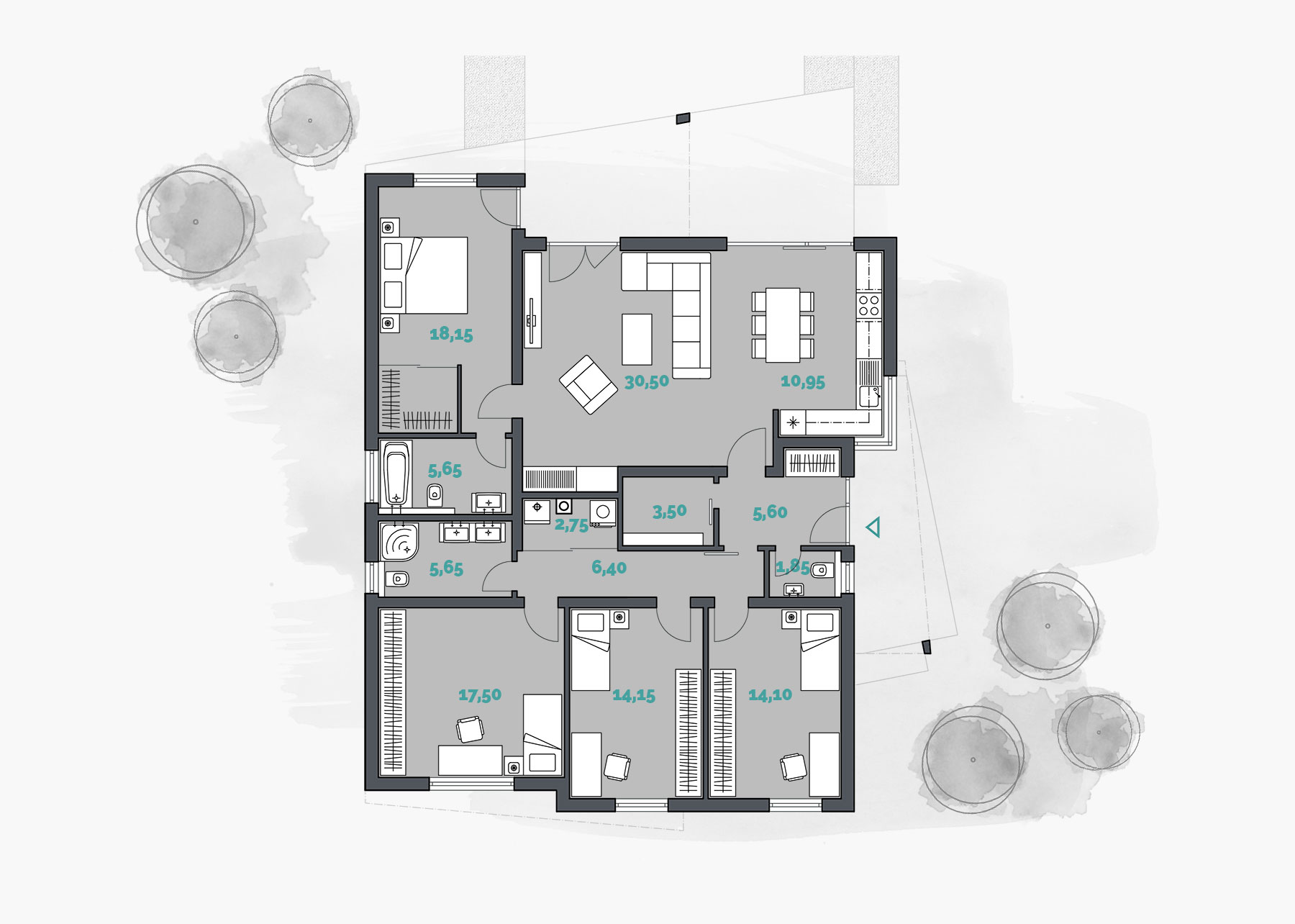 Typový rodinný dom cuatro je riešený ako samostatne stojaci jednopodlažný objekt bez podpivničenia s plochou strechou. Je určený na bývanie 5 člennej rodiny a vhodný pre rovinatý, prípadne mierne svahovitý terén.