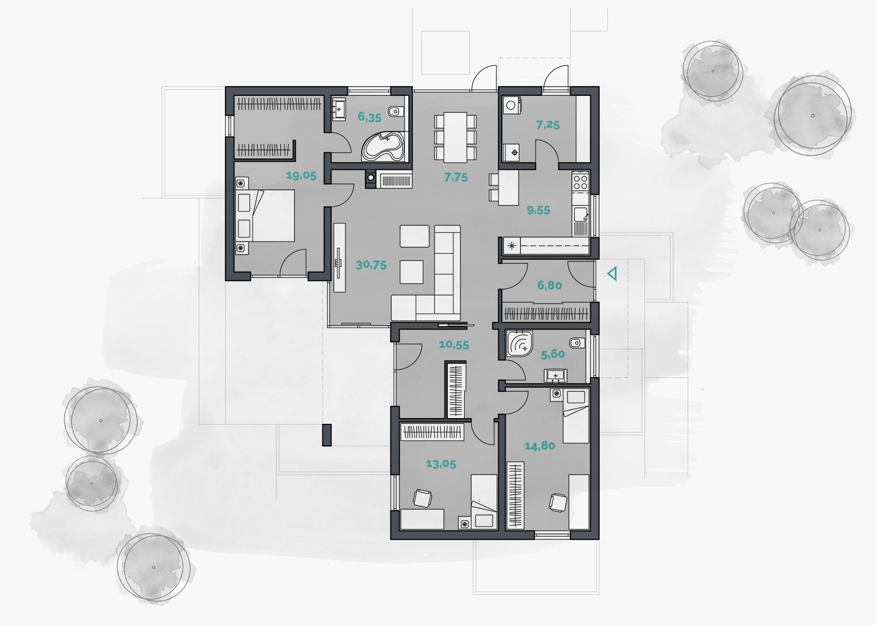 Ku katalógovému projektu je nutné, pre potreby stavebného povolenia, dopracovať tzv. osadenie na pozemok a pripojenie na inžinierske siete. Cenu za túto službu nájdete v cenníku - doplnkové služby.