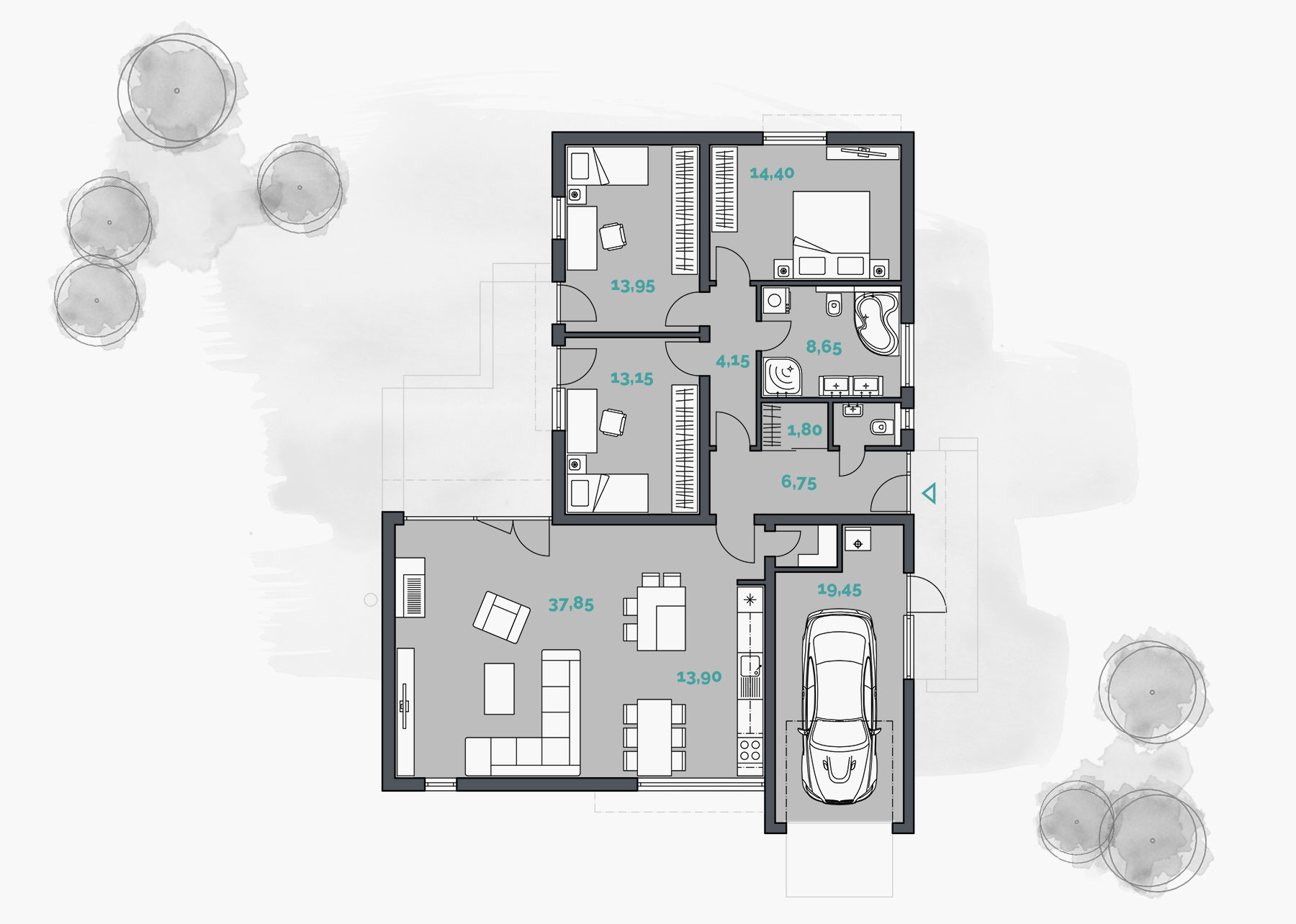 Typový rodinný dom gitaa je riešený ako samostatne stojaci jednopodlažný objekt bez podpivničenia s plochou strechou. Je určený na bývanie 4 člennej rodiny a vhodný pre rovinatý, prípadne mierne svahovitý terén.