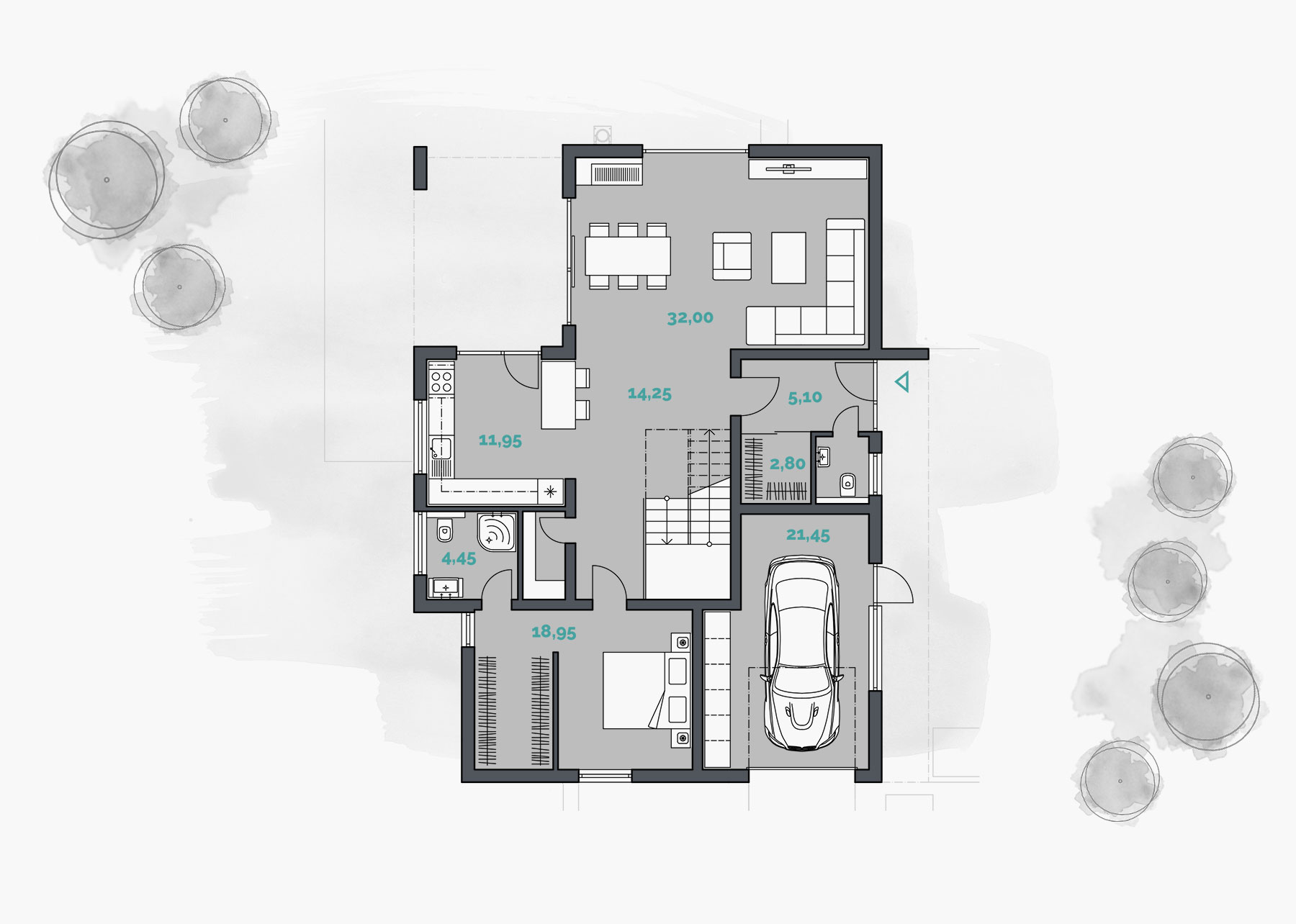 Na prízemí sa nachádza kryté závetrie, zádverie, WC, šatník, hala so schodiskom, komora, kuchyňa, obývacia izba s jedálňou, hosťovská izba so šatníkom a kúpeľňou, a garáž. Na poschodí sú dve izby, spálňa so šatníkom a kúpeľňou, kúpeľňa, WC, miestnosť pre kotol ústredného kúrenia, chodba a terasa. Jednotlivé podlažia sú prepojené schodiskom. Z jedálne a z kuchyne je možný prechod na krytú terasu, ktorá môže v letnom období slúžiť pre vonkajšie stolovanie. Do garáže je vstup riešený cez exteriér.